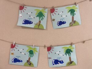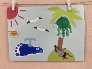 0歳児ひよこ組は、手型スタンプでヤシの葉、足型スタンプでクジラを表現しました🌊🐟