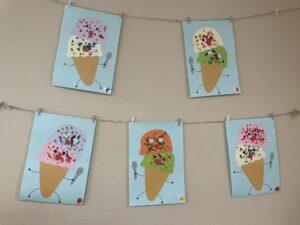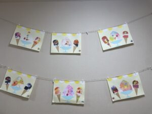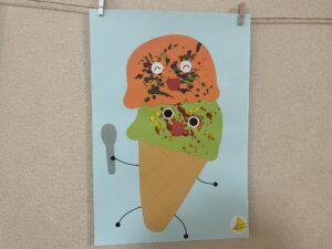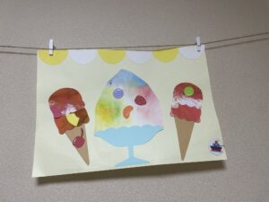 2歳児うさぎ組は、にじみ絵でかき氷、スポンジスタンプでアイスクリームに色付けしました🌈最後は果物を貼り付け、美味しそうなかき氷とアイスクリームが完成しました🍦