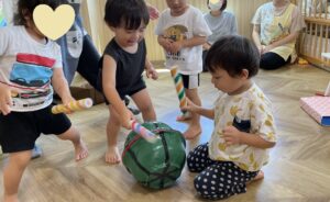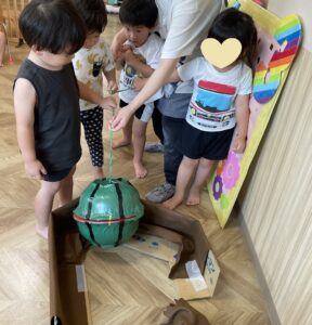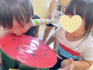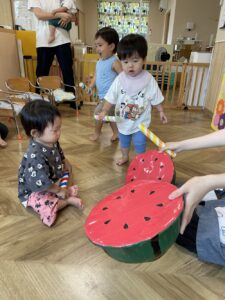 お話を見終えると、大きなスイカがやってきました!🍉 「うんとこしょ!どっこいしょ!」皆で力を合わせて引っ張ると・・・
