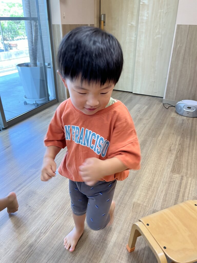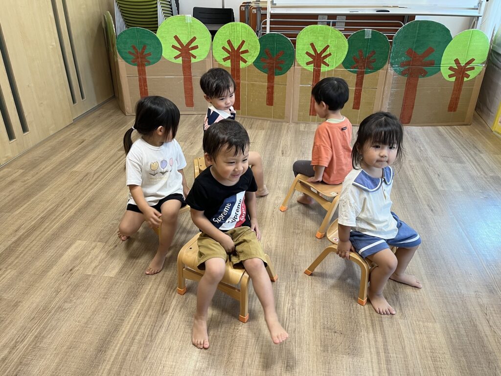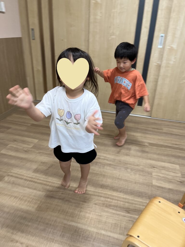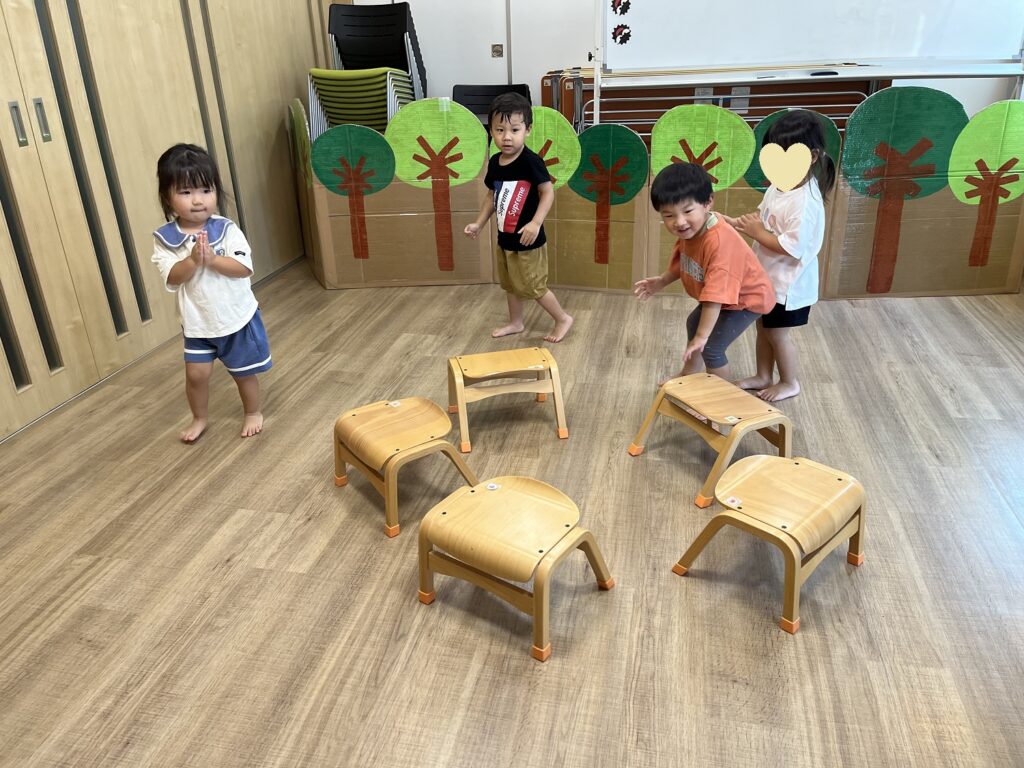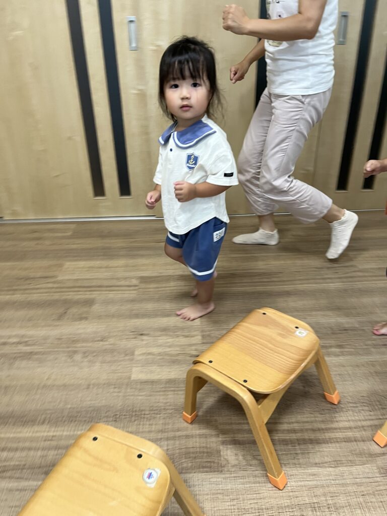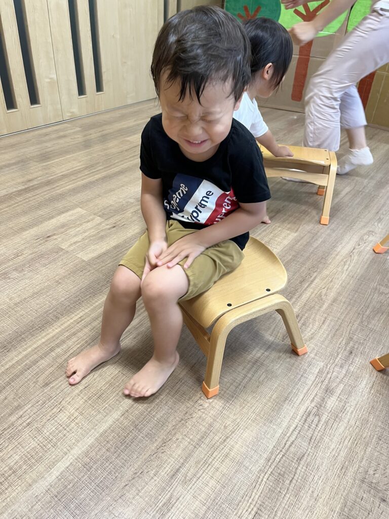 音楽に合わせて手拍子したり、動物になりきって歩いたりと、思い思いに回り✨音楽が止まると椅子を取られまいと一生懸命な子ども達でした😤中には保育者とお尻で押し合い、椅子の取り合いを楽しんでいる子もいました🤣