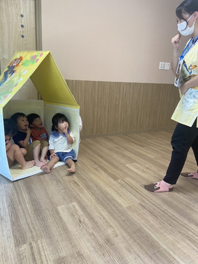 今回は皆で作ったお家も用意してみました♪狼が登場すると「しーっ静かに!」と、シーのポーズをとりながら、お家の中にぎゅうぎゅうで隠れている姿がとっても可愛らしかったです💕