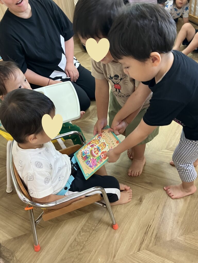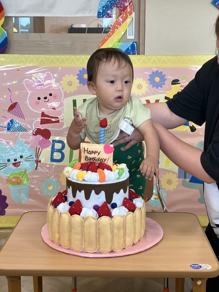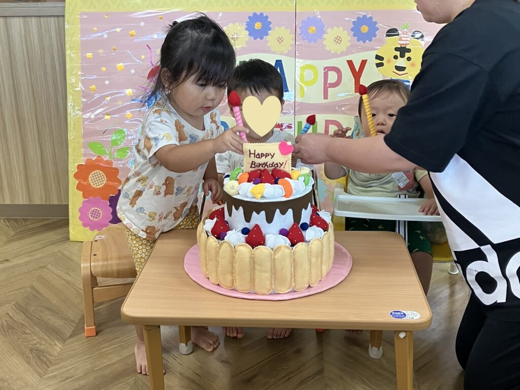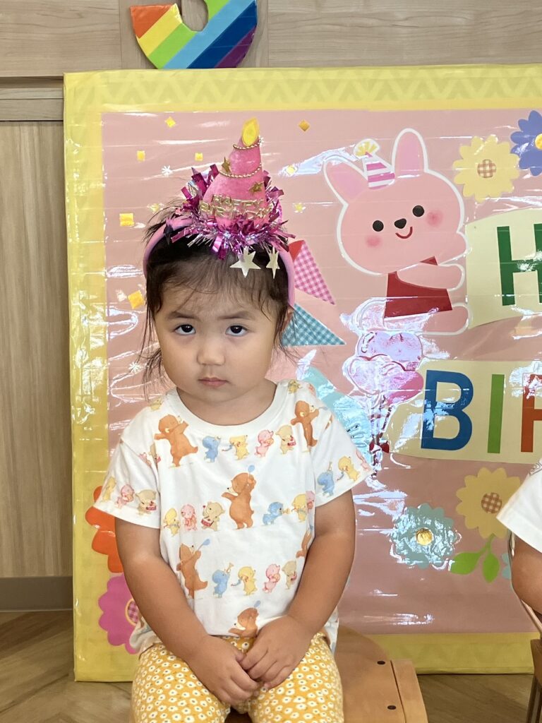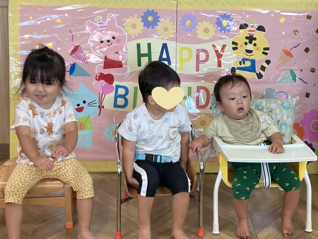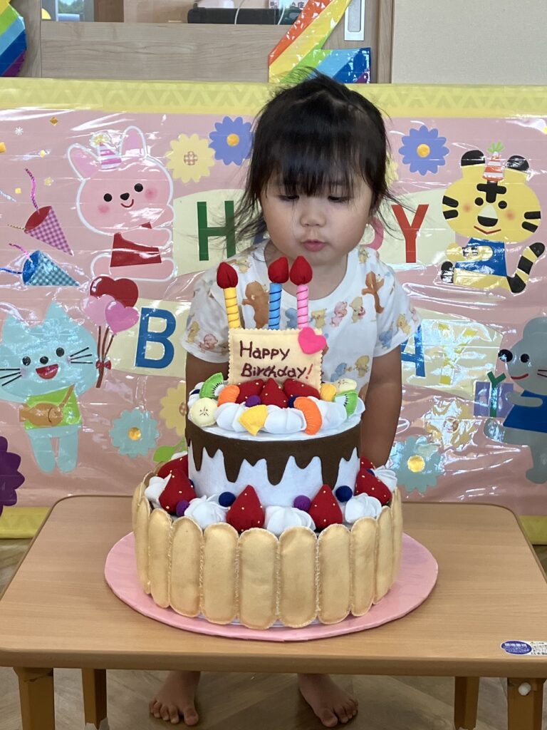 9月のお誕生会を行いました🍰 今月は各クラス一人ずつお誕生児さんがいて、「何歳になるでしょうか?」のクイズから始まり、お誕生カードを渡したり、ハッピーバースデーの歌を歌ったり、賑やかにお祝いしました👏 出し物も『まんまるクイズ』で「なんだろう?」と頭を悩ます子ども達。正解すると「やった~✨」と大喜びでした🎵