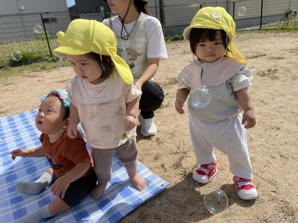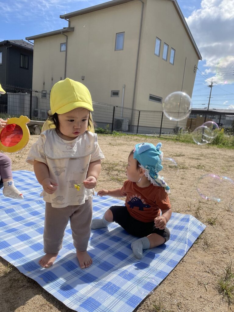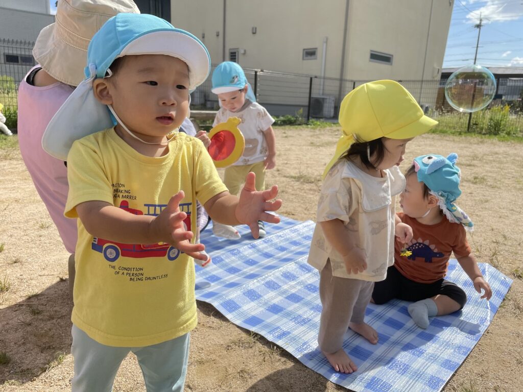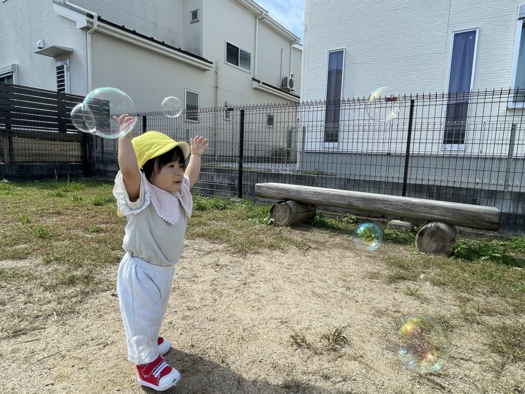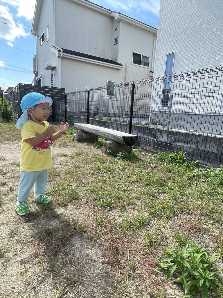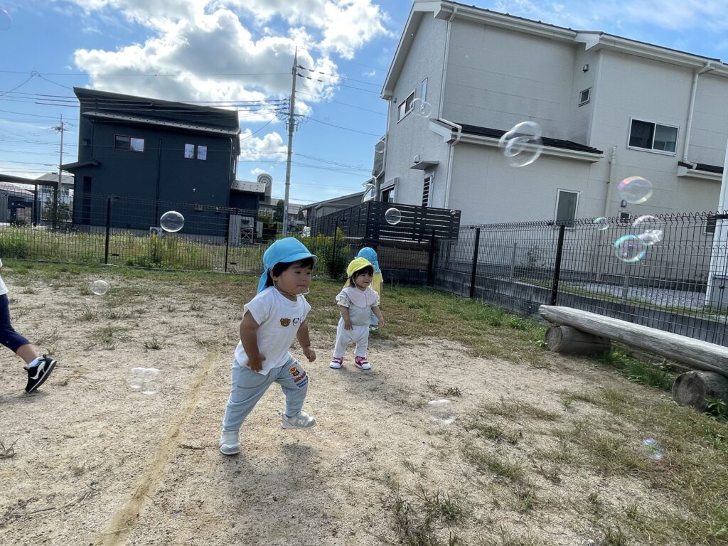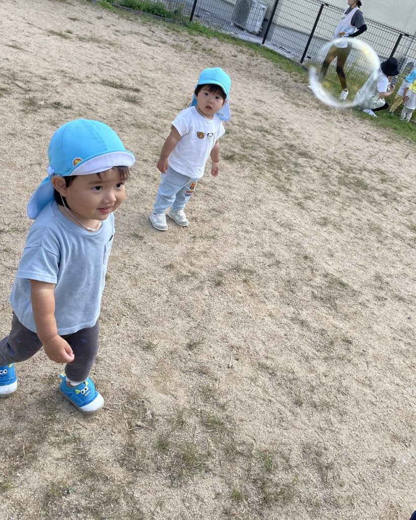 風に吹かれて飛んでいくシャボン玉を、これまた一生懸命追いかける子どもたちでした💕