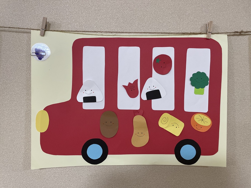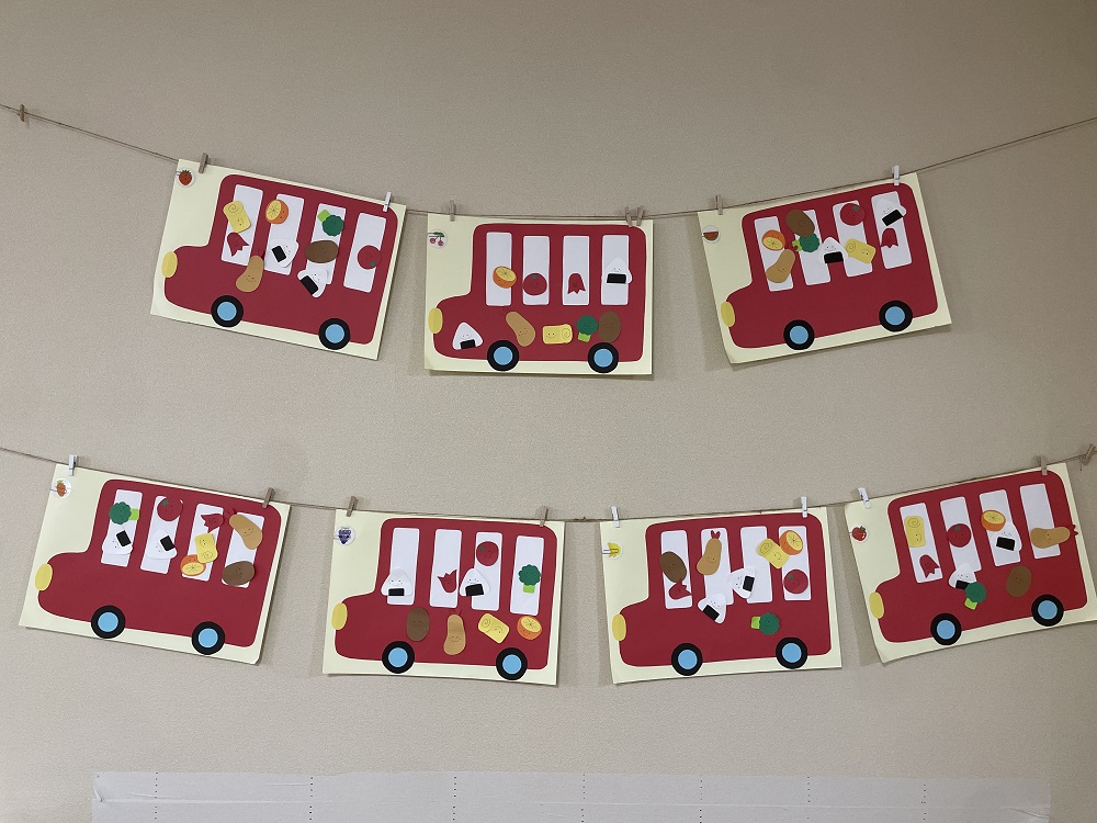 1歳児りす組は、子どもたちの大好きな絵本『お弁当バス』の制作をしました🍙