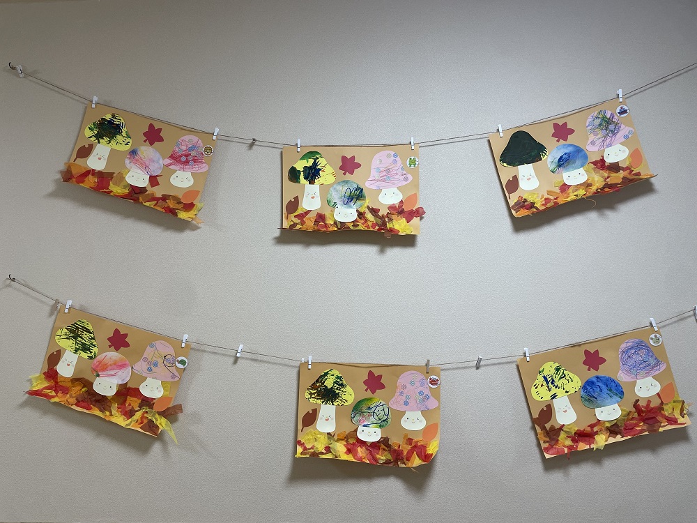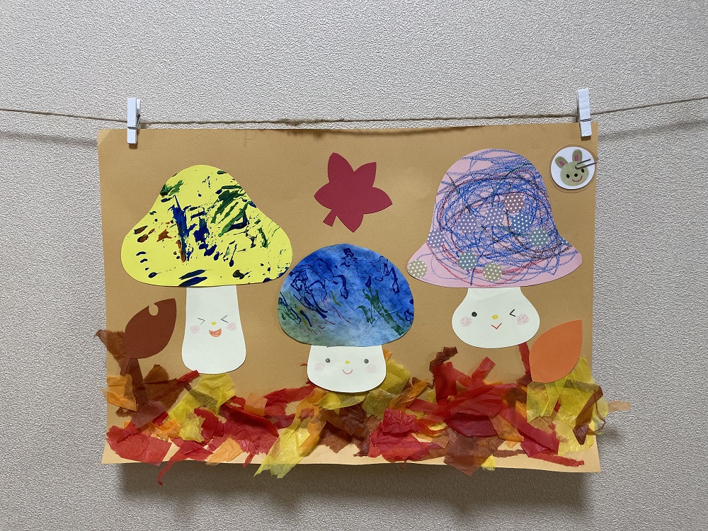 2歳児うさぎ組は花紙を落ち葉に見立て、【シール貼り、にじみ絵、フォークスタンプ】でキノコに模様をつけました🍄
