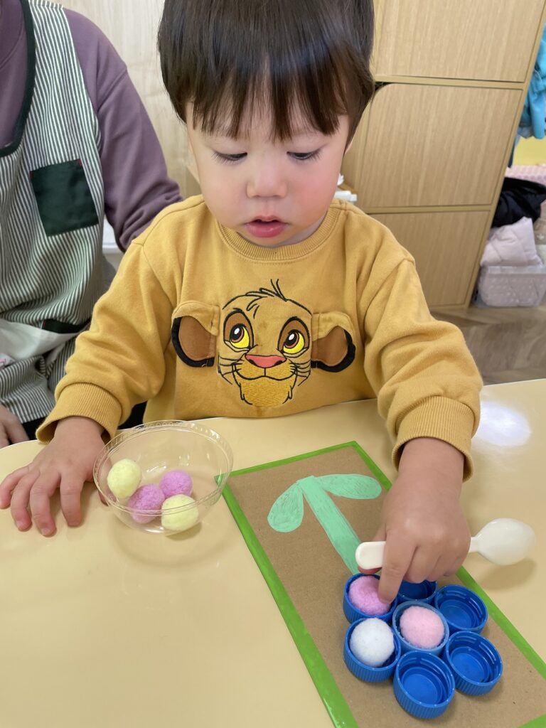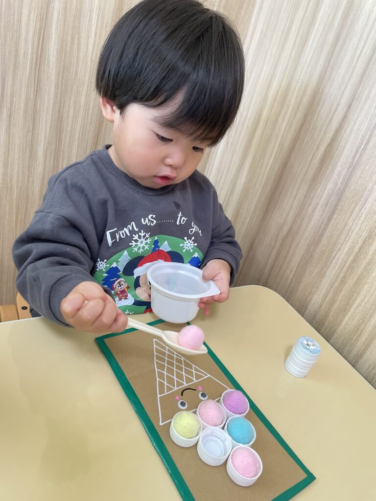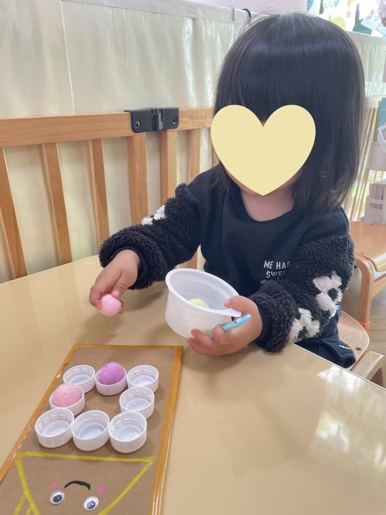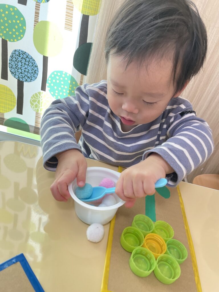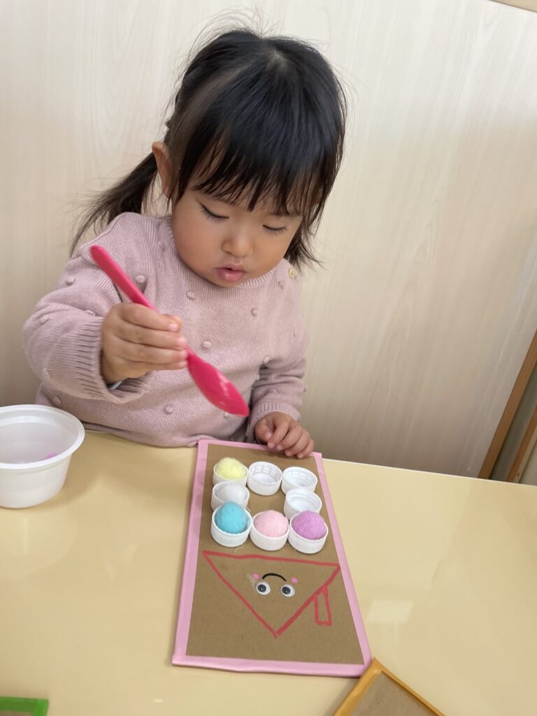 途中で面倒になって手で入れる子もいましたが、遊びの中で、スプーンの持ち方や運び方がわかると良いなと思っています😌