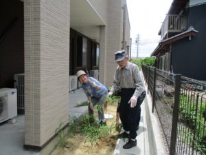 お隣さんから草が生えているのを教えていただき、草むしりを行いました。