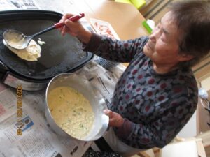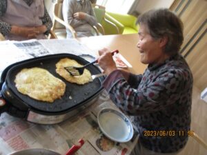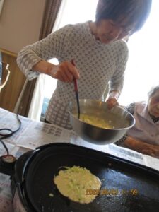 10時のティタイム中に昼食を尋ねると「お好み焼き食べたい」と言われお好み焼きを作りました。皆様お手伝い有難うございます。やはり鉄板でやるお好み焼きは最高ですね。