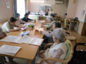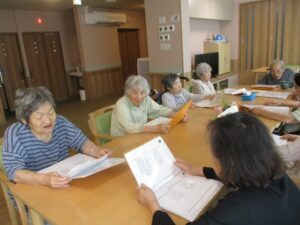 食事のあとは毎日、歌会をしています。皆様「歌はいいな。大きい声を出すとスッキリする」と笑顔で言われます。明日も元気に歌いましょうね。
