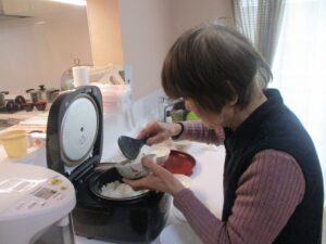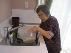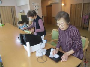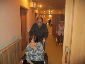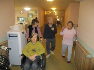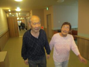 今日は雨が降っていたので他の利用者様と廊下を歩いておられました♪