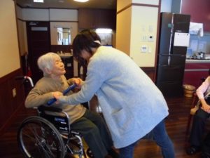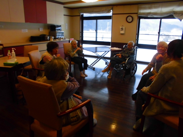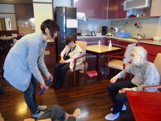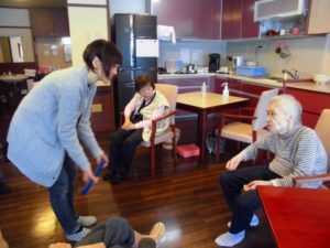 今日は皆さんでリビングに集まり棒を使って体操しました。