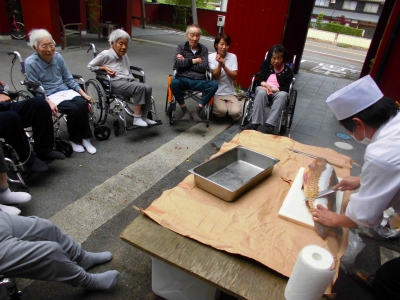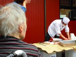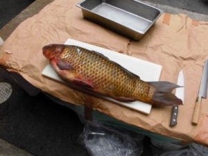 厨房の職員による、「鯉の解体ショー」を
