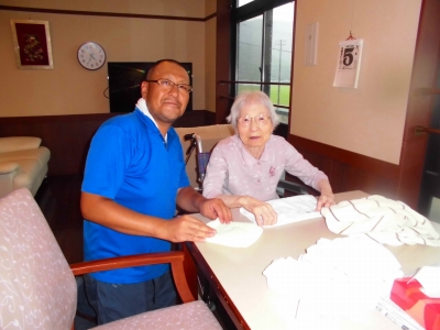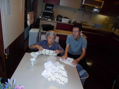 今日も普段と変わらず、職員と一緒に洗濯物をたたんでくださいました。