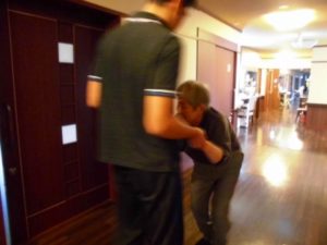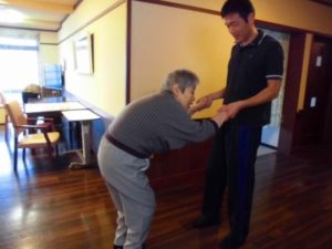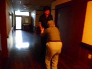 本人様が「歩くわ」と仰られた際、理学療法士が手引きにて歩行の補助をしています。