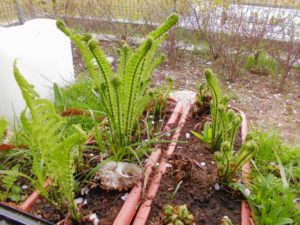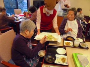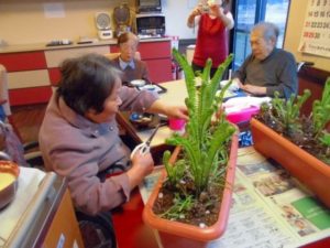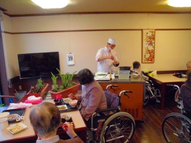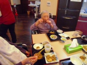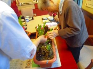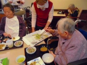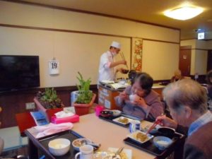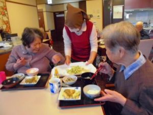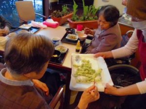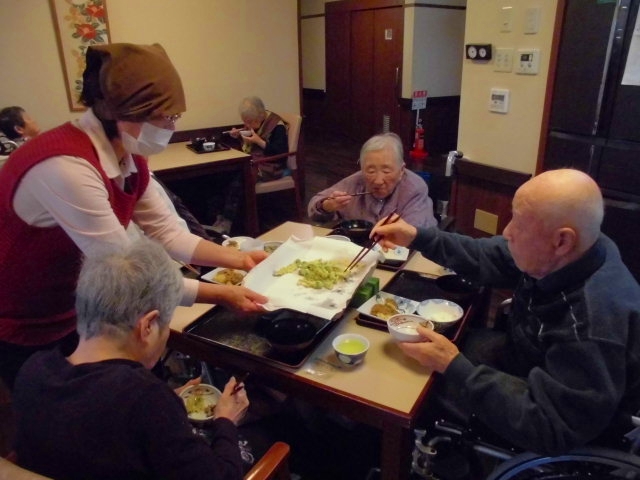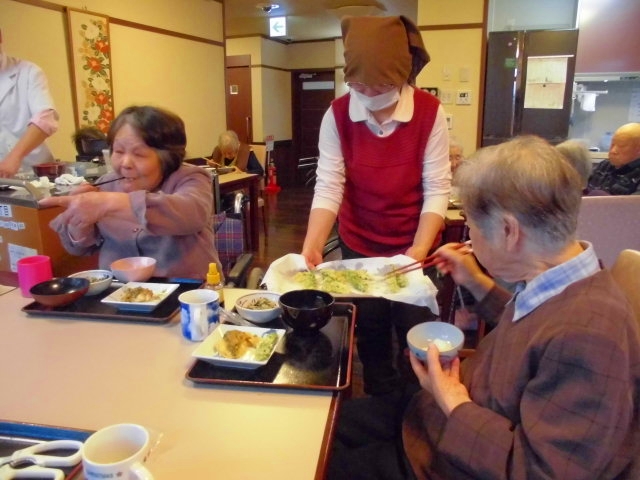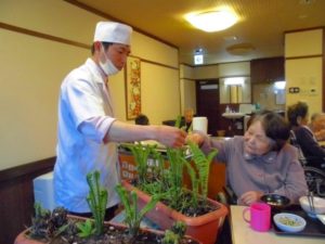 まんてんで育てた「こごみ」をみんなで収穫し、料理長がその場で天ぷらにしました。