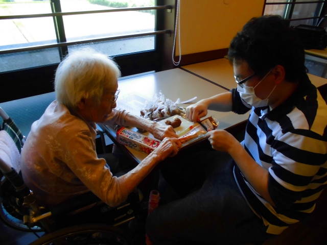みそ汁の味噌ダマ作りを手伝って下さっています。