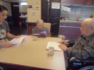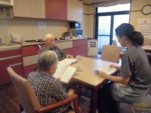 日課である『おつとめ』をリビングでされています。皆さん読まれる時はとても大きな声で言って下さっていました。