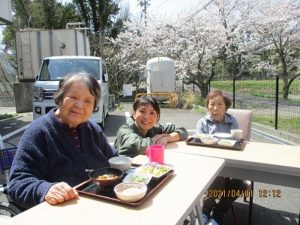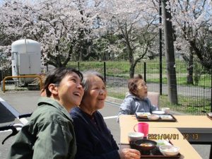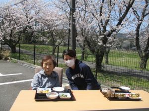 今日は天気も良く外でお花見をしながら食事を食べました。(❁´ω`❁)