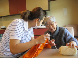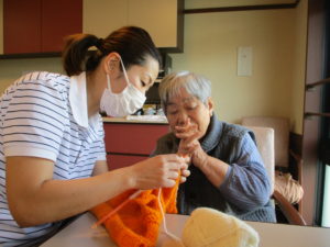 編み物を女性職員に。
