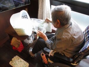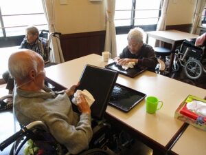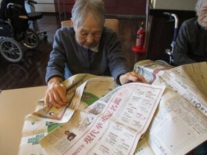 本日も利用者の皆様が、ご自身でできる新聞紙折りやお盆拭き等を意欲的に取り組んでくださいました。
