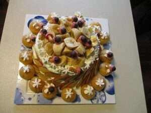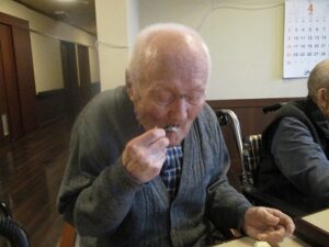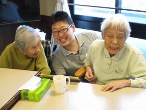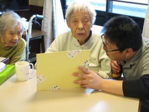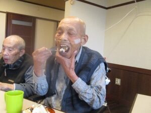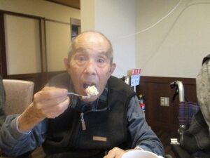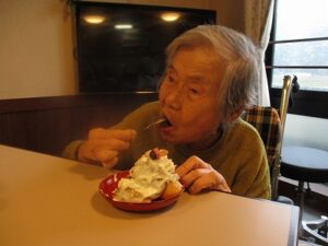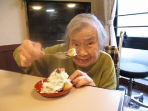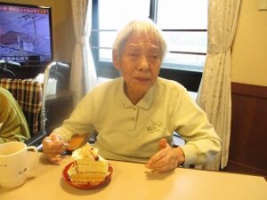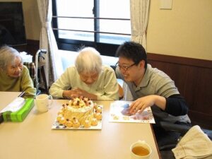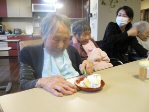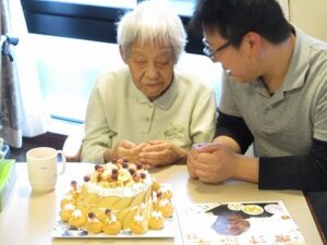 ケーキの周りにシュークリームも飾り付けてあり、そのビジュアルに「なんと立派な!」と驚かれる入居者もおられました。