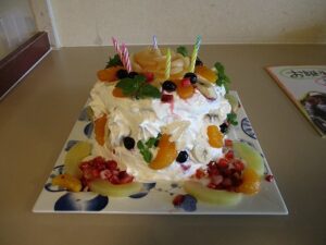 ご本人様ご希望のケーキと、色紙をプレゼントさせて頂き、皆様と一緒にお祝いさせて