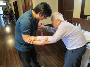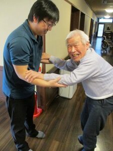 歩行練習の時の様子です。少しでも自分の力で歩いて頂けるようスタッフと一緒にリハビリ。