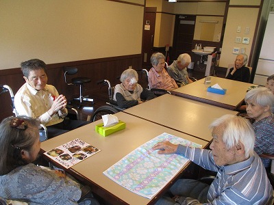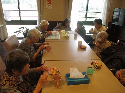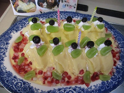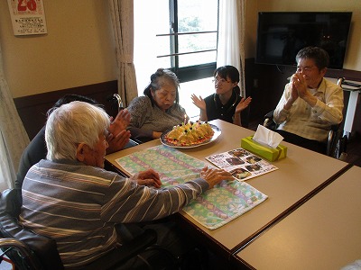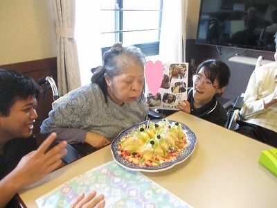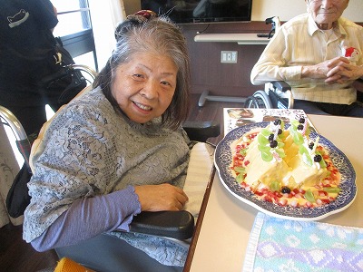 色紙を贈呈し、誕生日をお祝いする歌を皆様で歌い、ご本人希望のフルーツケーキでお祝いさせていただきました。