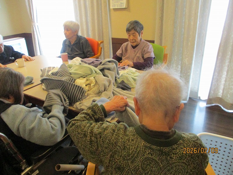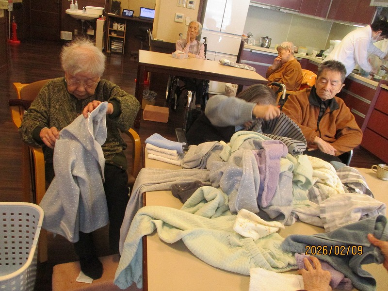たたみものを一緒に畳みました。