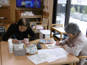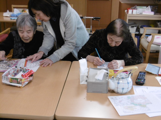 今日はお昼から皆で塗り絵を楽しみました。 いつぶりかの塗り絵で、皆さま時間を忘れて好みの色をどんどん置いていきます。 手を動かし集中してくると、いつしか一生懸命に。 カラフルで色々な表情の塗り絵が完成しました。