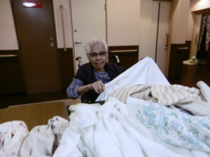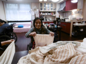 ご利用者に役割を持って頂き生活の質を高める。日中、ご利用者に洗濯物をたたんで頂き、