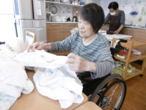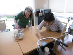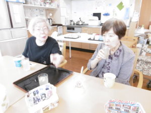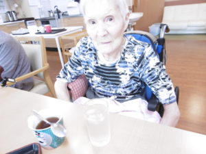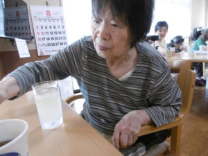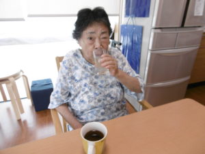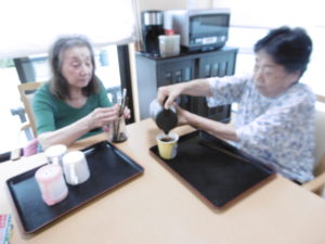 食事前には、テーブルを拭いて手指消毒後、おぼんを並べてお茶を入れて下さいます。