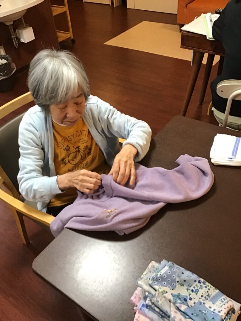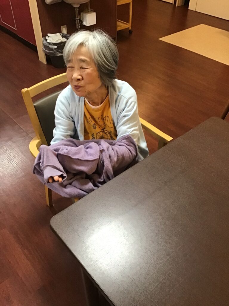 昼が近づいて少し暖かくなってきました。上着を脱いだら、自分の上着をたたみ、邪魔にならないようにしてます。テレビを見ながらにっこり^ – ^リラックスされてます!
