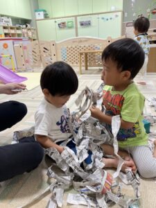 う~んと引っ張ってみたり、ビリビリとやぶいてみたりと新聞の感触を楽しんでいました。