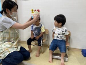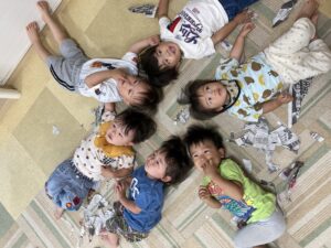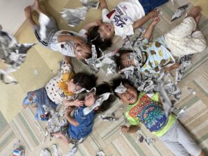 雨が降ってくるよ~☔と新聞の雨が降ってくると「キャ~」と大喜びの子どもたちでした(^^♪