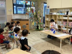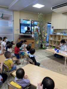 職員の出し物で『たなばなさまのおはなし』のペープサートを見ました(^^♪