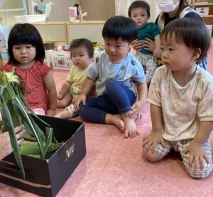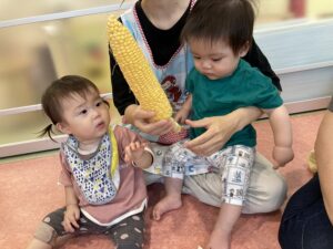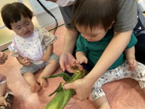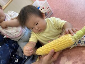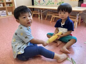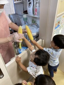 むけたとうもろこしを給食の先生へ「どうぞ!」と渡しに行きました♪