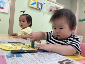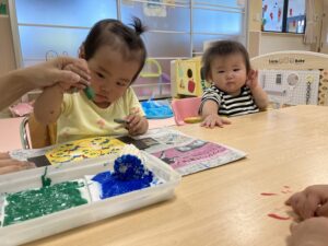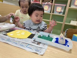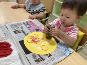 夏野菜の形や、触った感触を確かめながら、スタンプしました(^^)
