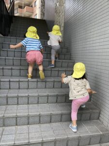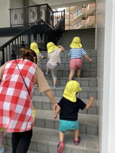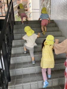 避難場所まで階段を登る練習をしました。