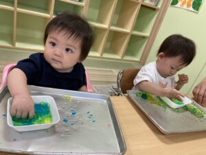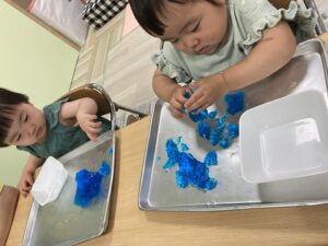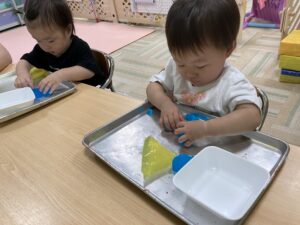最近ひよこ組さんは寒天を使って感触遊びをしています(^^)/