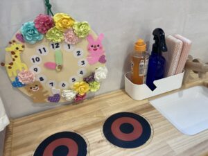 時計を飾って「今何時~」と子どもたちが